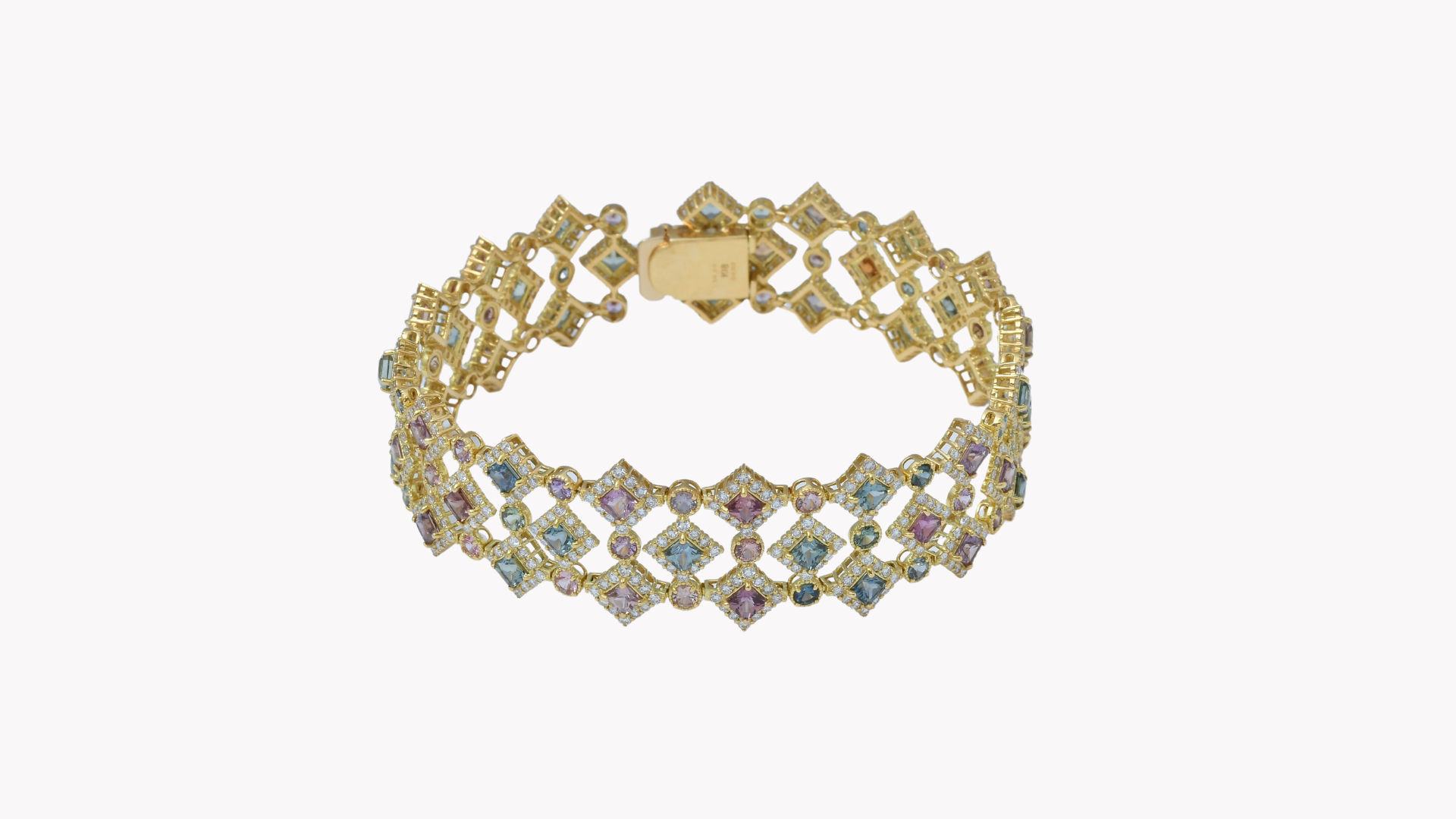 石にこだわった日本ジュエリーの最高峰。こだわりの石とデザインに定評がある逸品です。18Kイエローゴールドにマルチカラーサファイアとアクセントダイヤモンドをパヴェセッティングした、幅広デザインのブレスレットです。