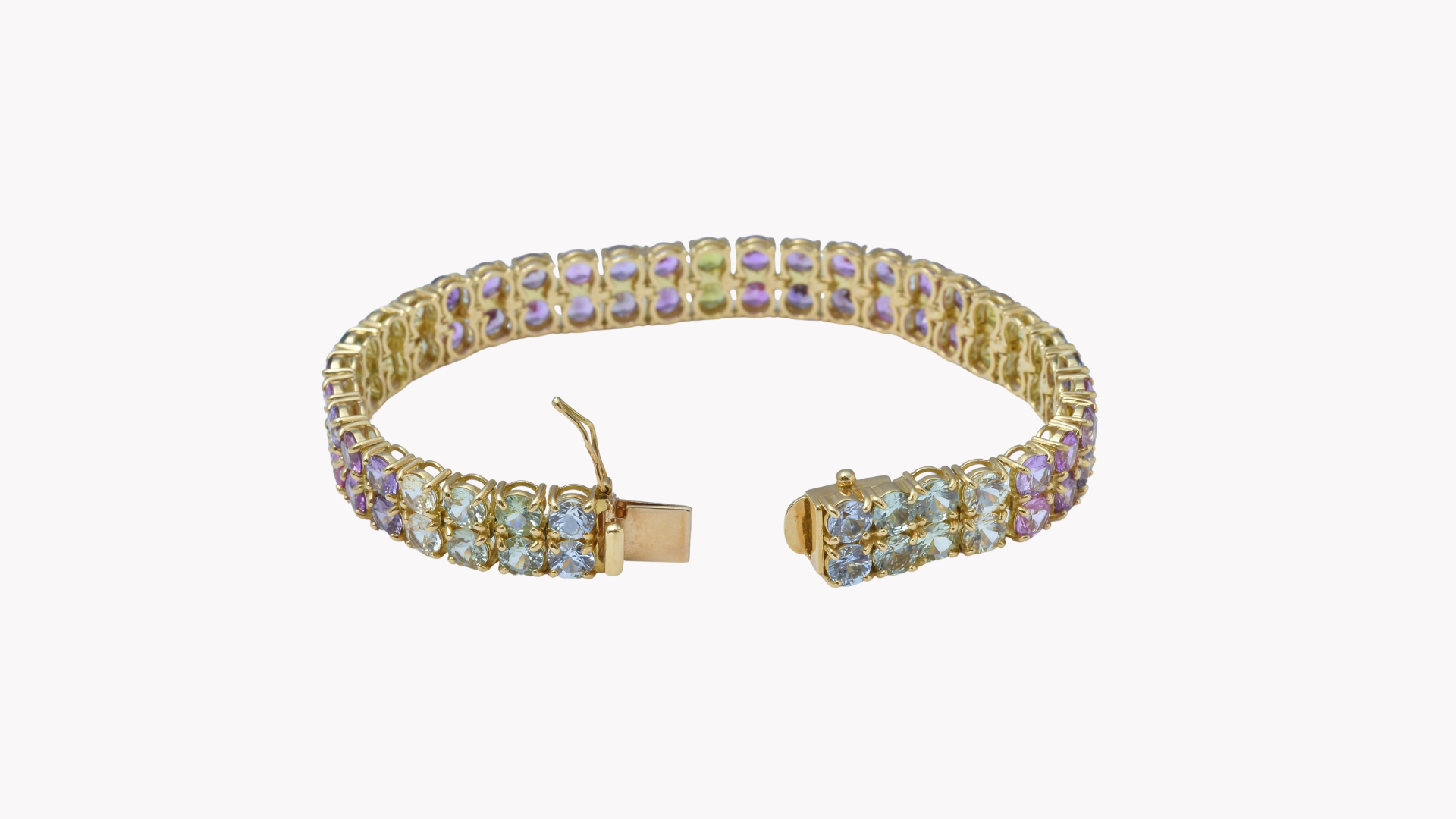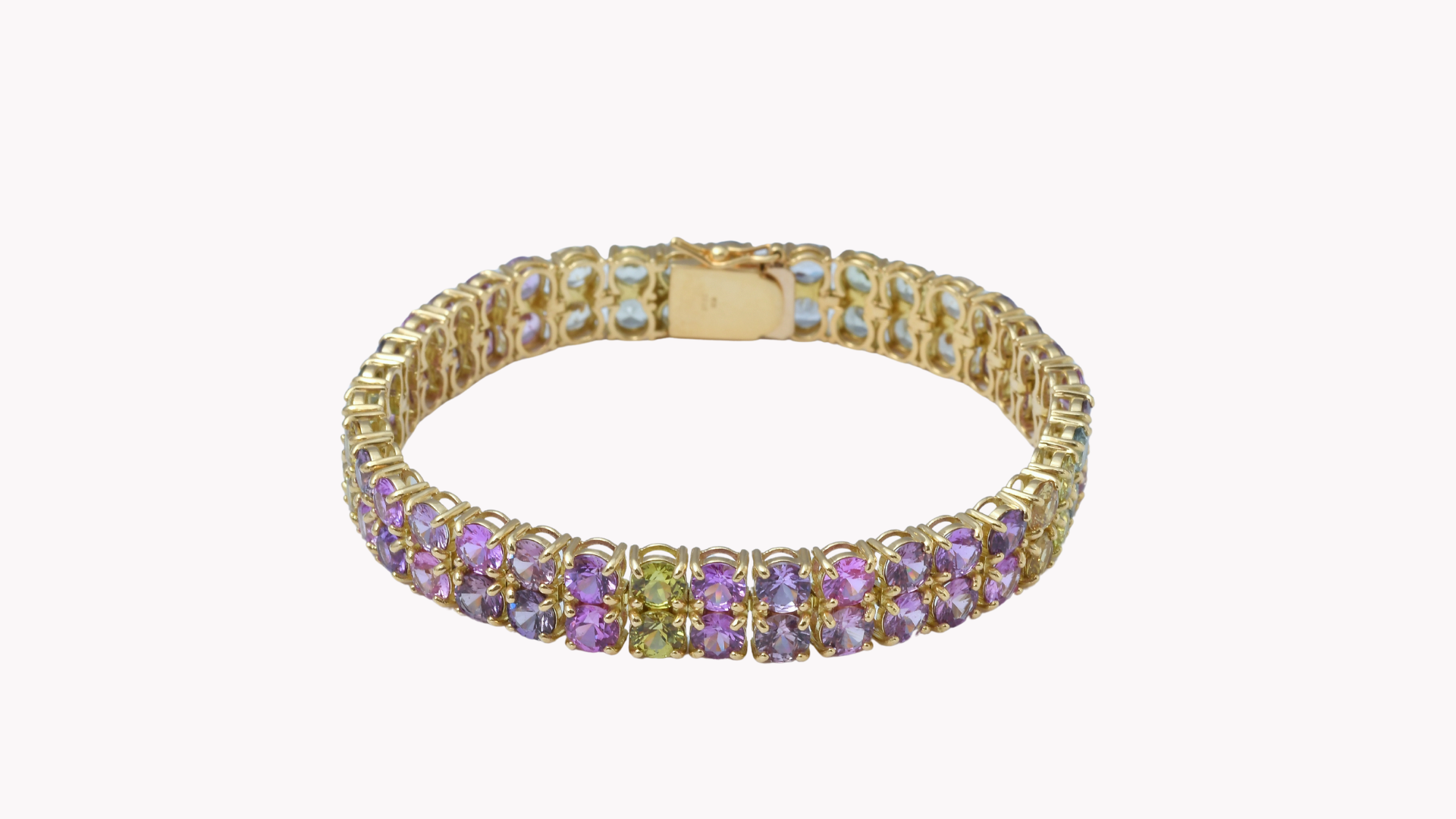 石にこだわった日本ジュエリーの最高峰。こだわりの石とデザインに定評がある逸品です。ピンク、イエロー、バイオレットのサファイアを交互に配した、エレガントなラインブレスレットです。