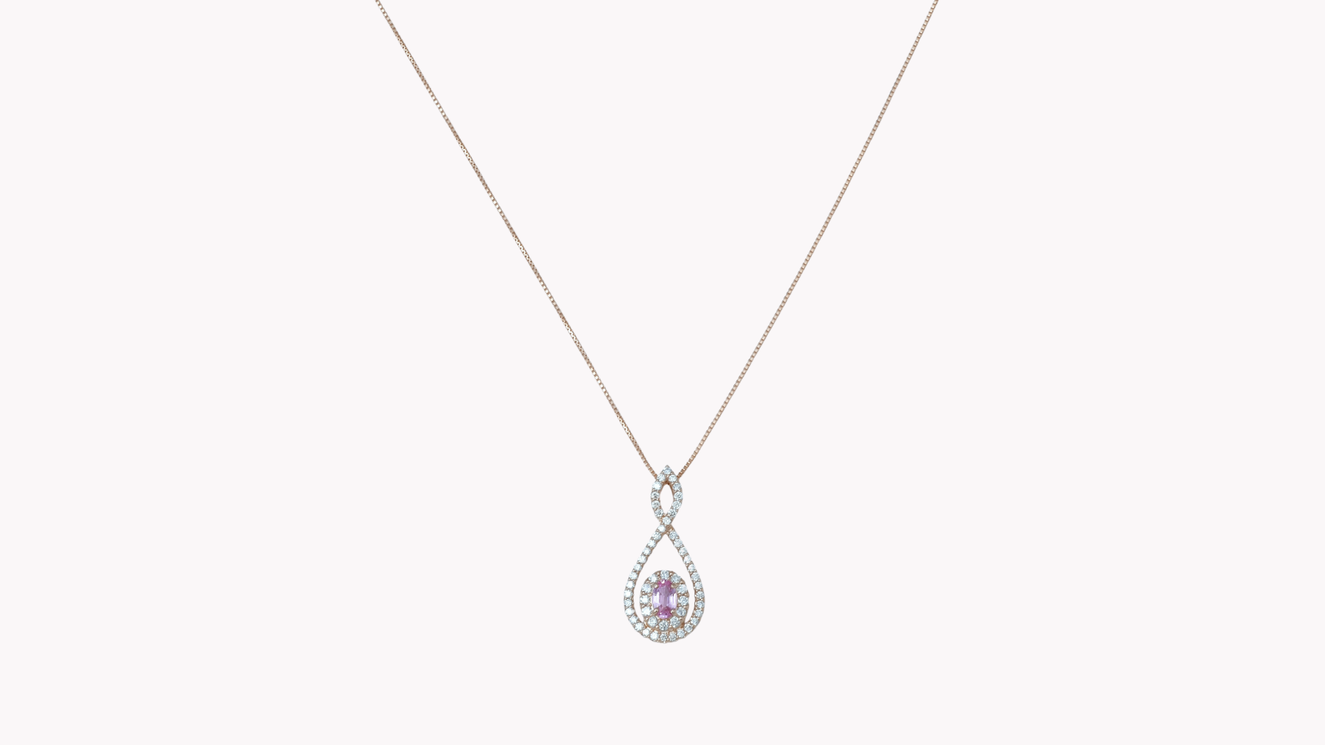 石にこだわった日本ジュエリーの最高峰。こだわりの石とデザインに定評がある逸品です。K18ピンクゴールドのスレッダーチェーンにペアシェイプのパパラチアサファイアとダイヤモンドをセットした繊細なペンダント。