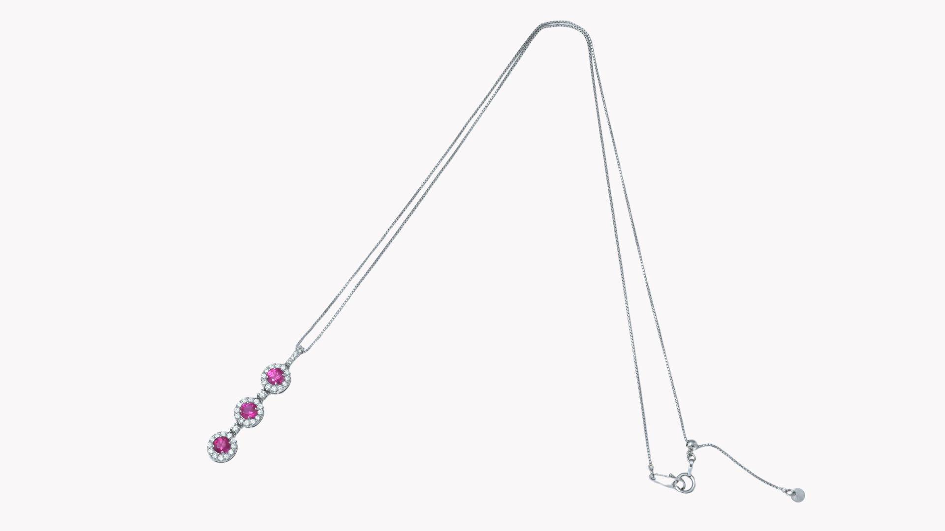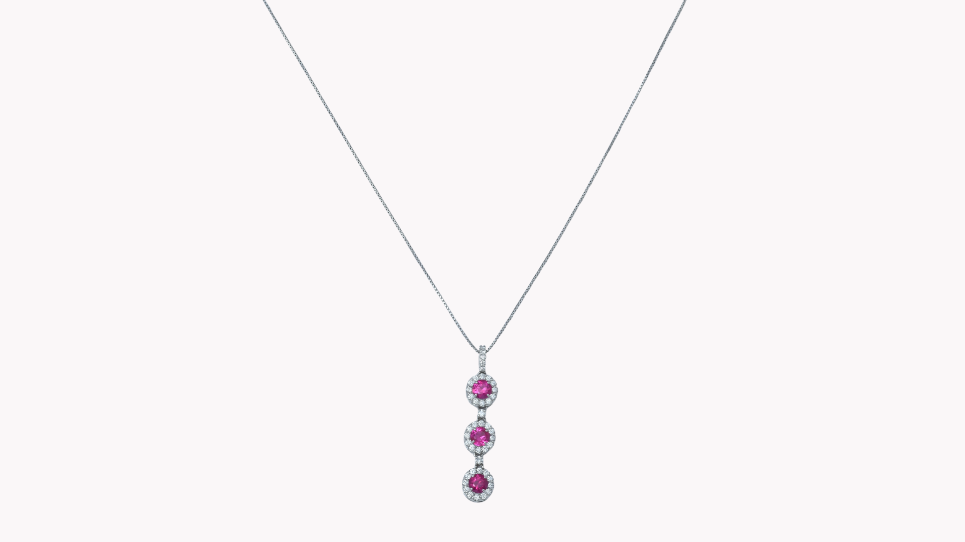 石にこだわった日本ジュエリーの最高峰。こだわりの石とデザインに定評がある逸品です。プラチナチェーンに3石のルビーを縦に連ね、各石をダイヤモンドで囲んだラグジュアリーなペンダント。