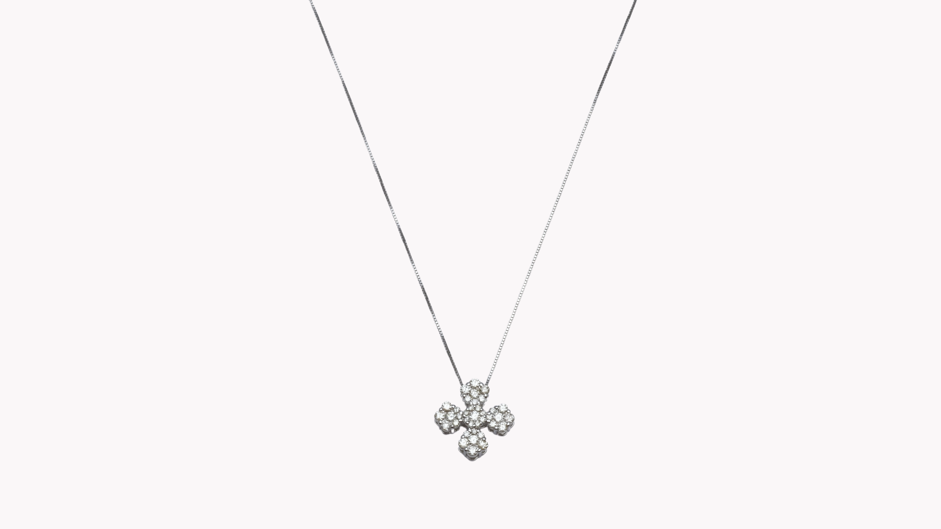 美しい石と作り手の想いを乗せた個性的なジュエリー。品質の良いジュエリーがお届けできるシリーズです。K18ホワイトゴールド、雪の結晶風モチーフ。宝石の総重量 1.000g。