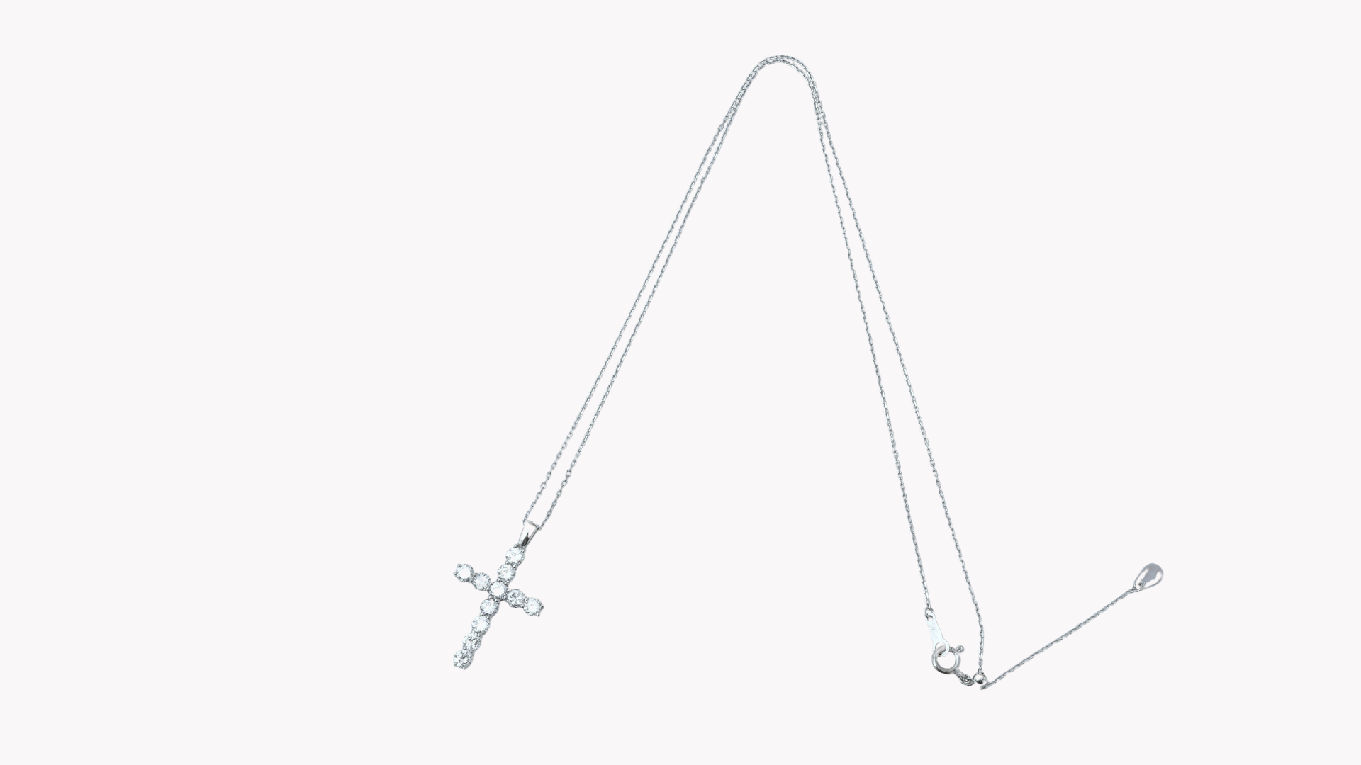 お洋服に合わせて日常をより素敵な気持ちで過ごせる楽しいジュエリーシリーズです。もちろん歴史あるメイドインジャパンのお品です。1.10ctのダイヤモンドをあしらった18金ホワイトゴールドの可憐なクロスモチーフ。全長45 cm。