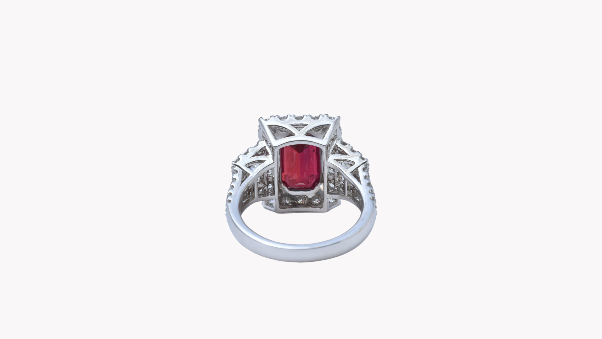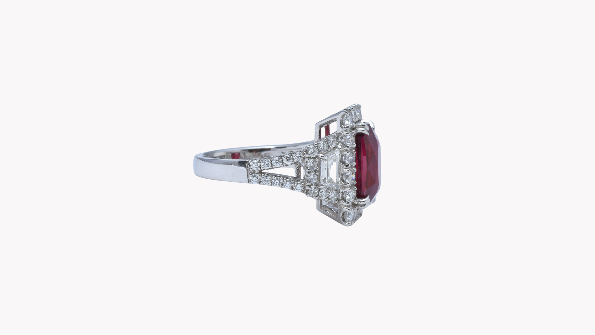 ピジョンブラッドルビーをセンターストーンに、ダイヤモンドをあしらったプラチナ製ハローリング。このルビーは人工的な処理をしていないNo-Heat。