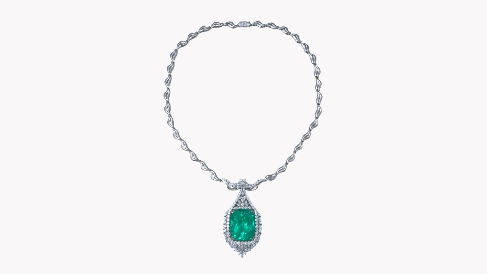 石にこだわった日本ジュエリーの最高峰。こだわりの石とデザインに定評がある逸品です。鮮やかなエメラルド・カボションをダイヤモンドのハローで囲んだ、存在感のあるペンダントです。