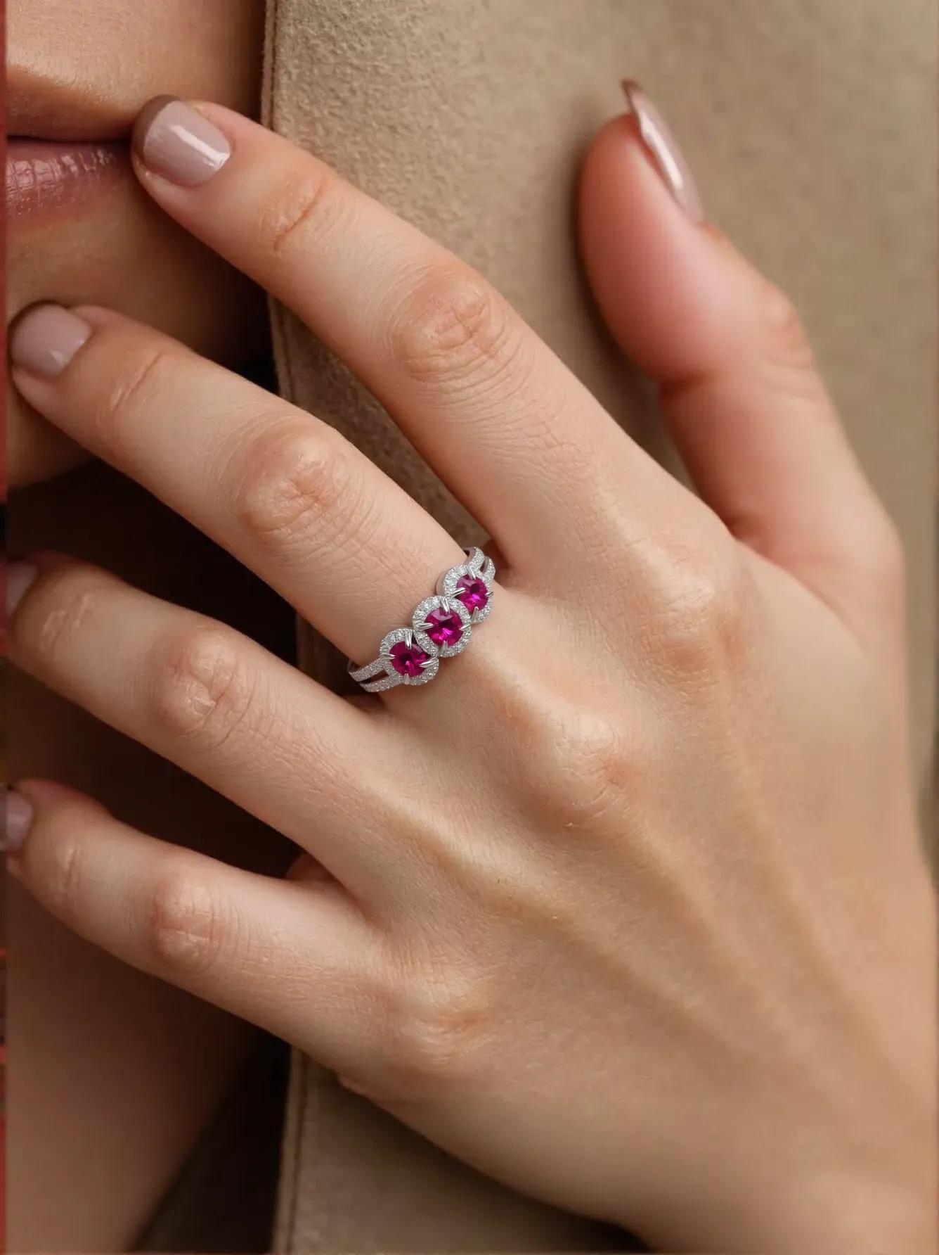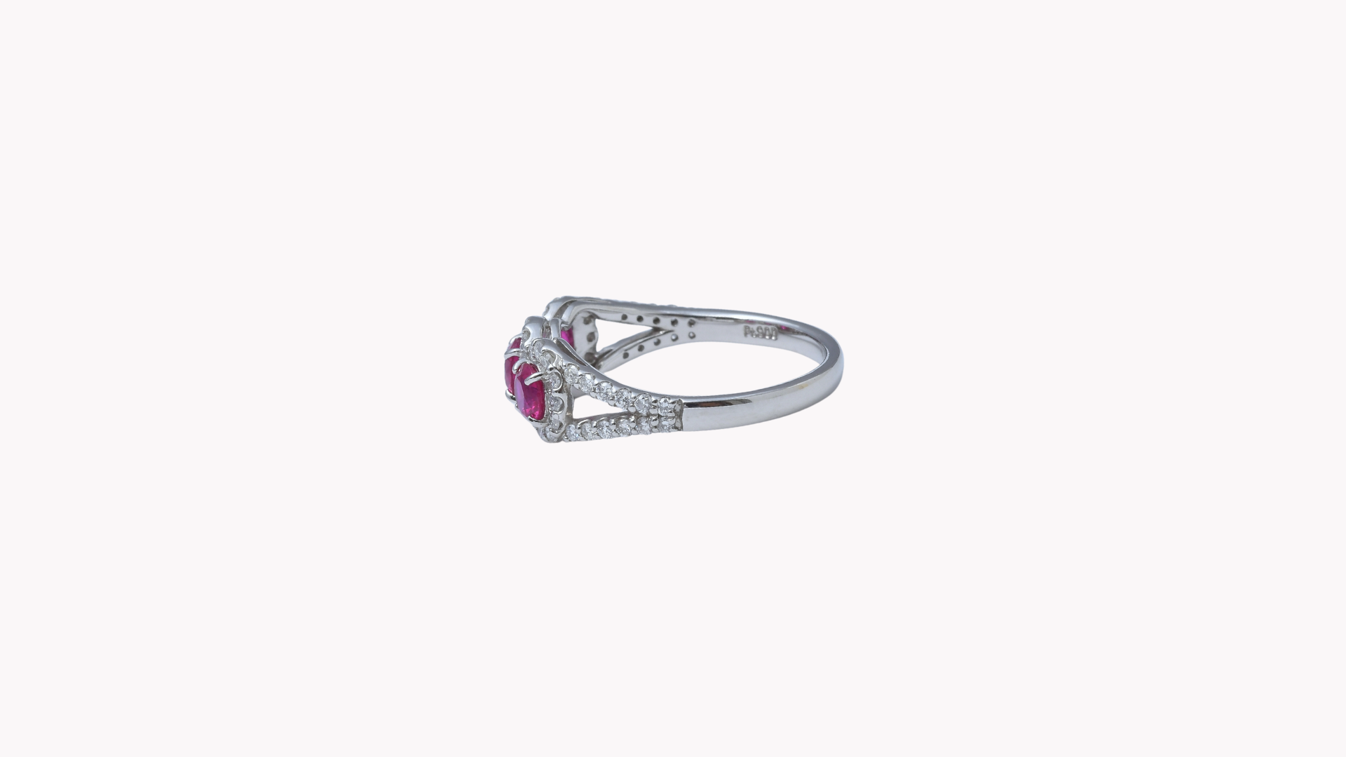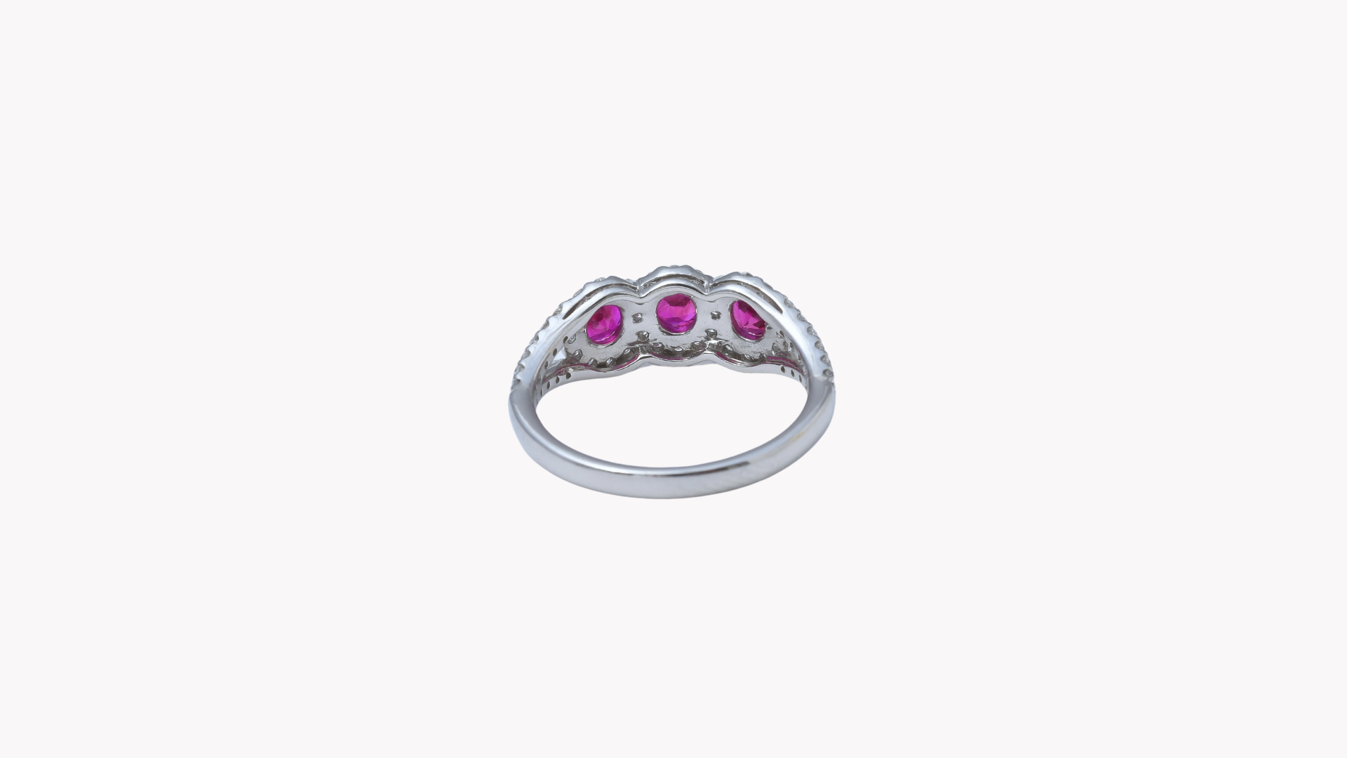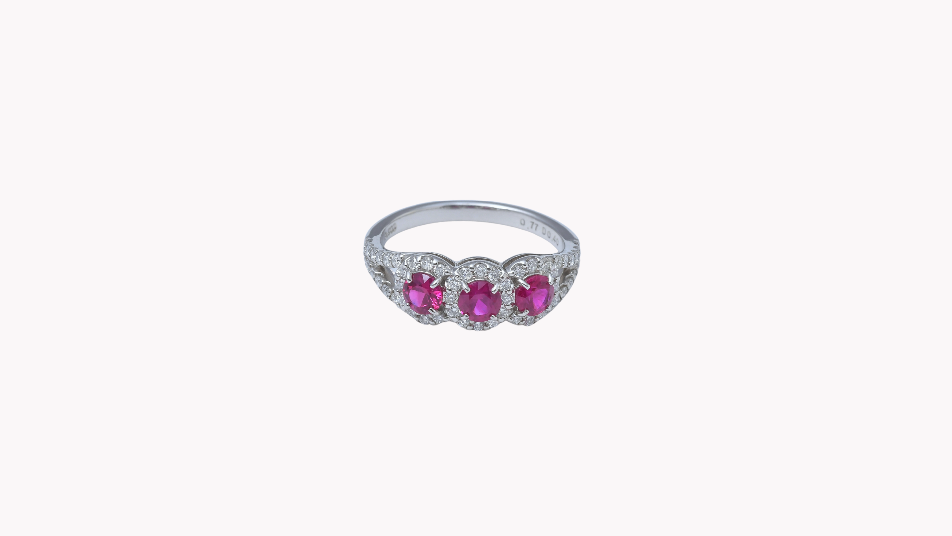 石にこだわった日本ジュエリーの最高峰。こだわりの石とデザインに定評がある逸品です。総計0.770ctのルビー3石と0.400ctのダイヤモンドを配したプラチナバンドリング。