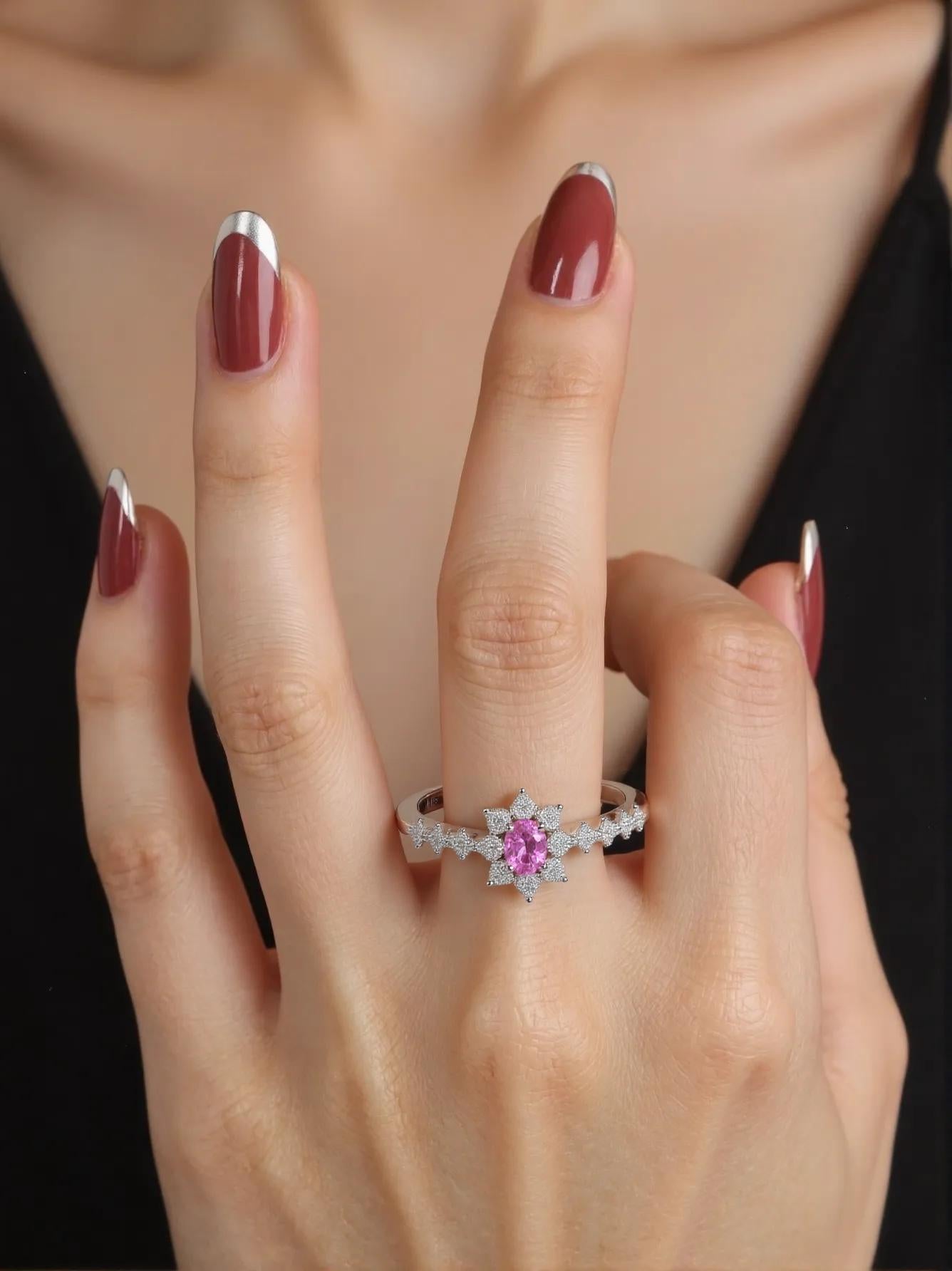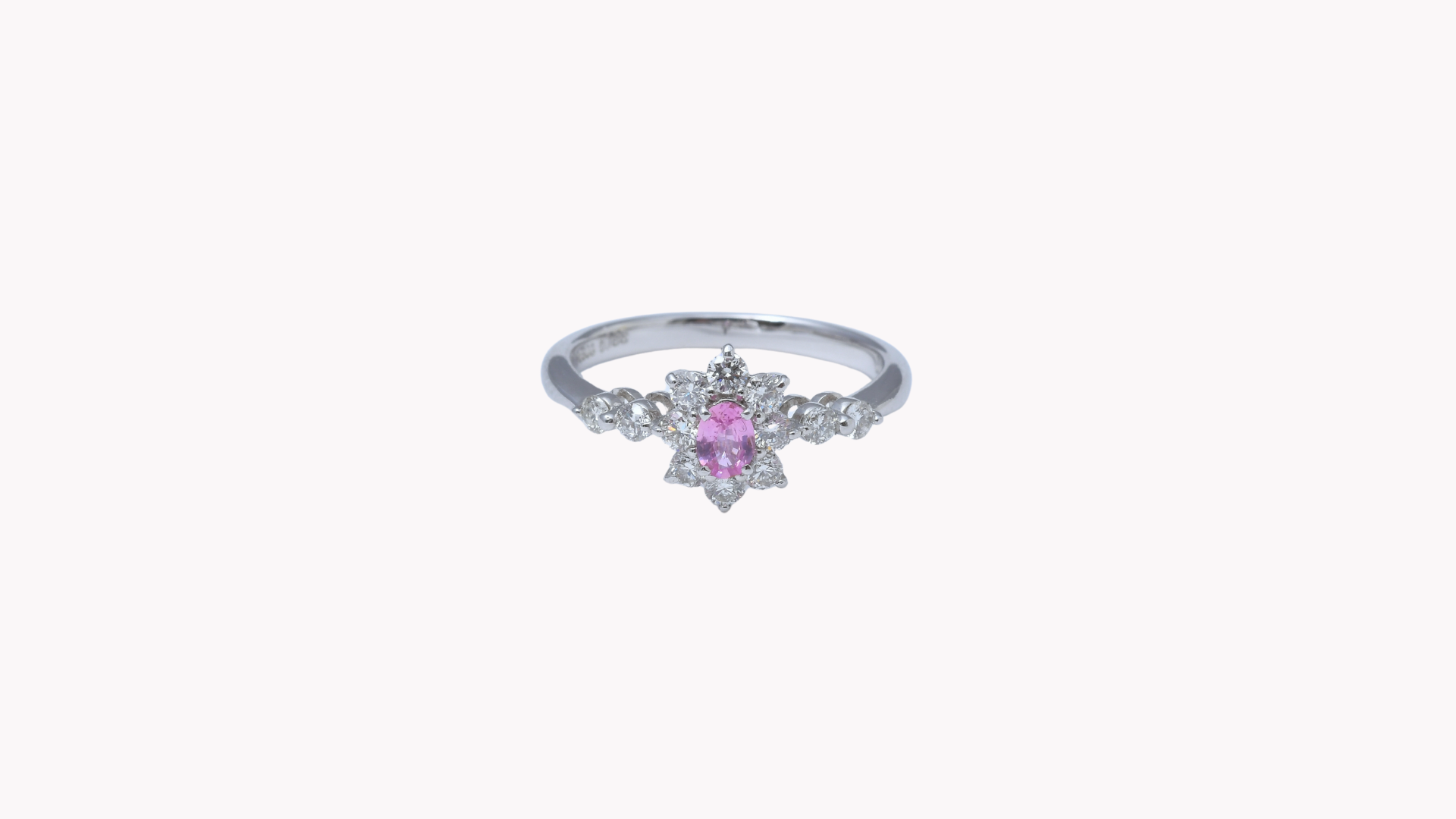 石にこだわった日本ジュエリーの最高峰。こだわりの石とデザインに定評がある逸品です。0.185ctのパパラチアと0.450ctのダイヤモンドをセットしたティアラスタイルのリング。