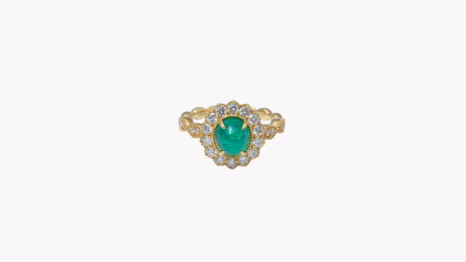 石にこだわった日本ジュエリーの最高峰。こだわりの石とデザインに定評がある逸品です。1.768ctのエメラルドカボションを0.710ctのダイヤモンドで取り巻いたK18イエローゴールドリング。