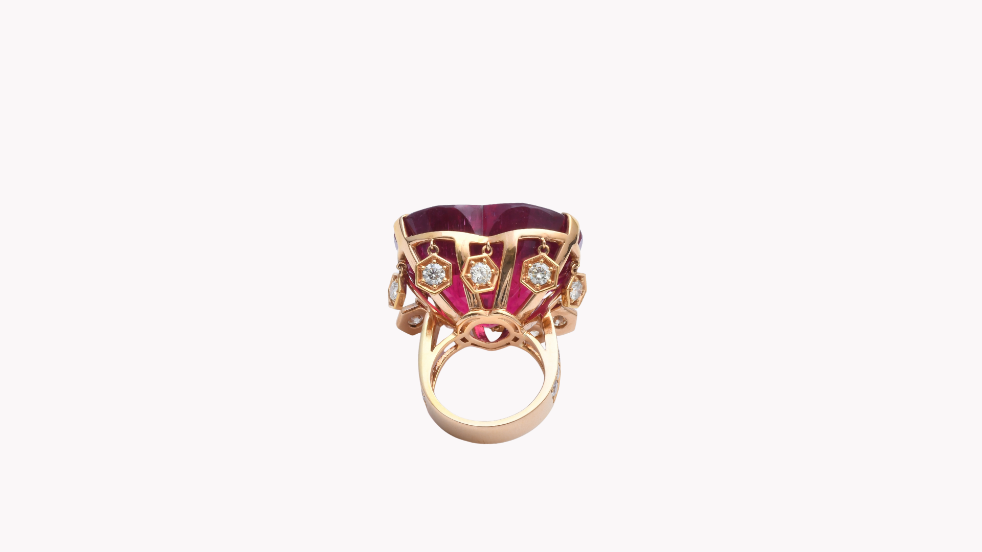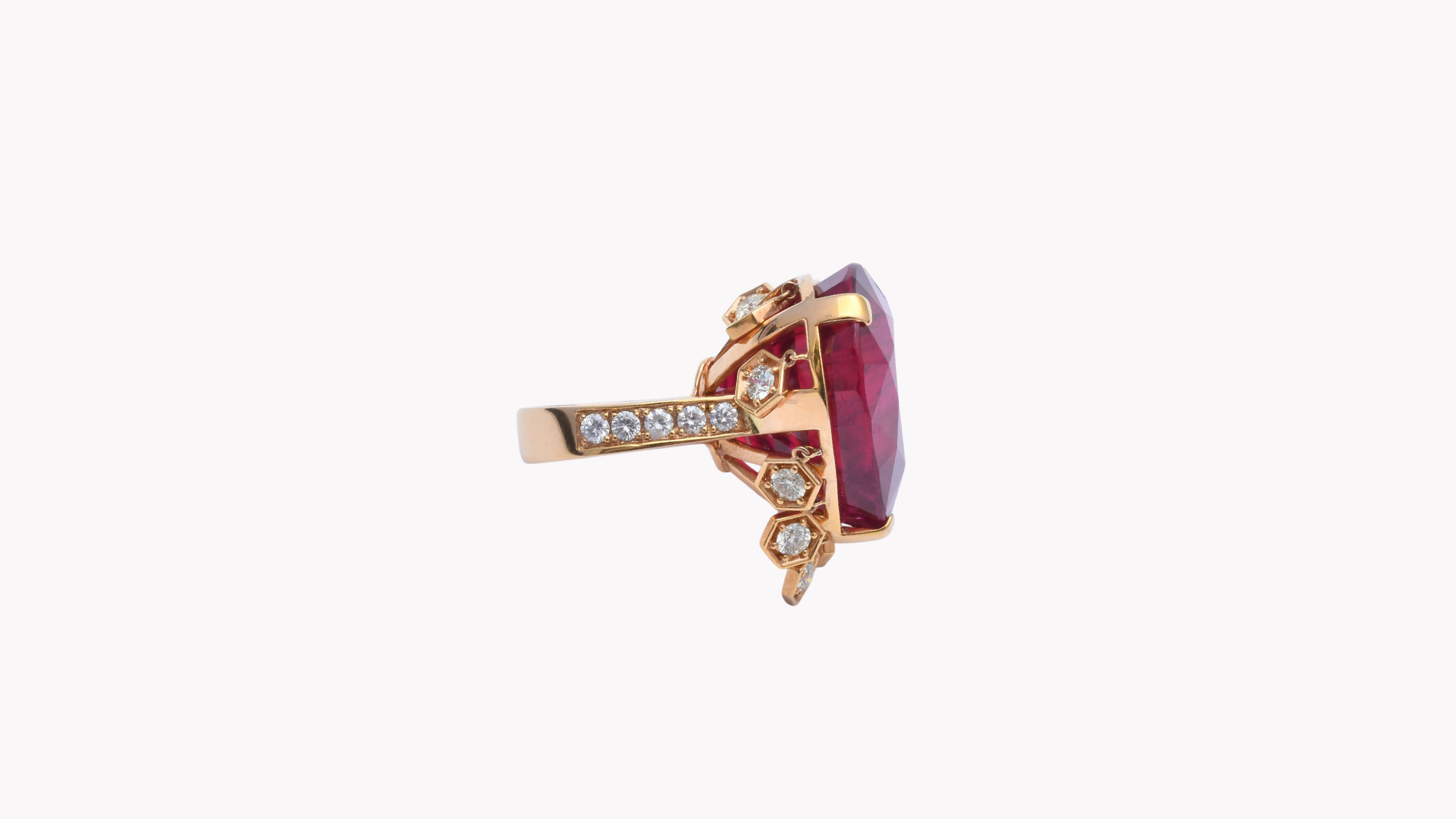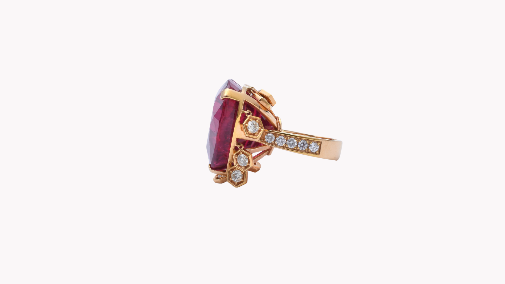 美しい石と作り手の想いを乗せた個性的なジュエリー。品質の良いジュエリーがお届けできるシリーズです。Rubellite 86.74 ct とダイヤを配した 18K イエローゴールドリング。